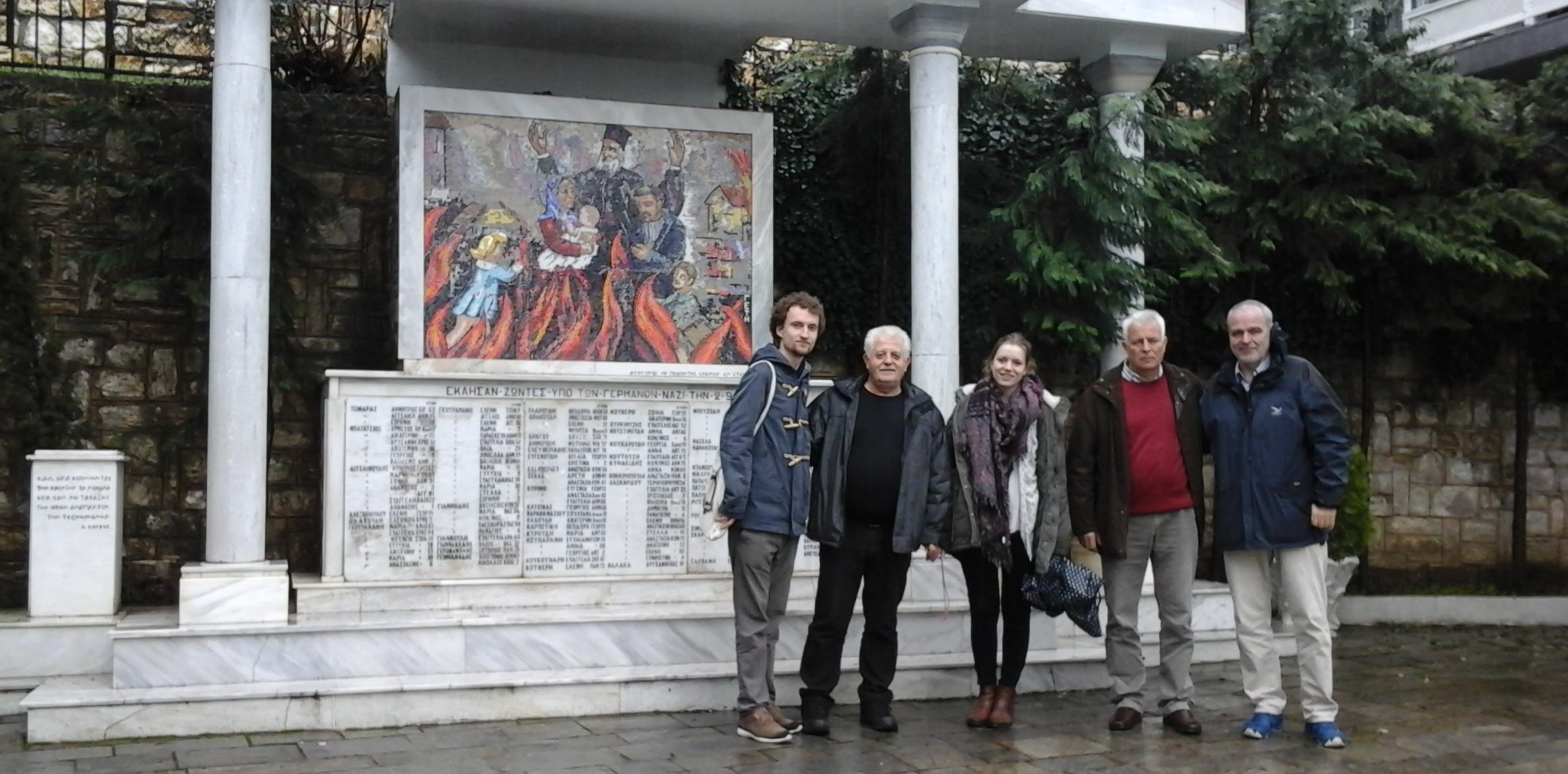 Nach etwa 45 Minuten Fahrt mit dem Linienbus an einem verregneten Freitag erwartet uns an der Bushaltestelle bereits Vaios, ein früherer Stadtrat und langjähriger Bekannter mit seinem Auto und bringt uns in den Ort. Dort lernen wir als erstes Georgios, den Ortsvorsteher, kennen, der uns alle zum Kaffeetrinken in die Cafeteria begleitet. Im Gespräch erfahren wir dann die Einzelheiten des schrecklichen Verbrechens durch die deutschen faschistischen Wehrmachtstruppen: Am 2. September 1944 ermordete das Jagdkommando Schubert, eine Wehrmachtseinheit, den Ortsvorsteher und den Ortspfarrer auf grausame Art und Weise. Die beiden Töchter des Pfarrers wurden brutal vergewaltigt. Die im Ort verbliebene, überwiegend weibliche Bevölkerung wurde mit den Kindern zusammengetrieben und in zwei Backstuben gebracht. Dort wurden die Eingesperrten angezündet und verbrannten bei lebendigem Leib. Nur einigen Kindern gelang die Flucht durch ein kleines Fenster ins Freie.