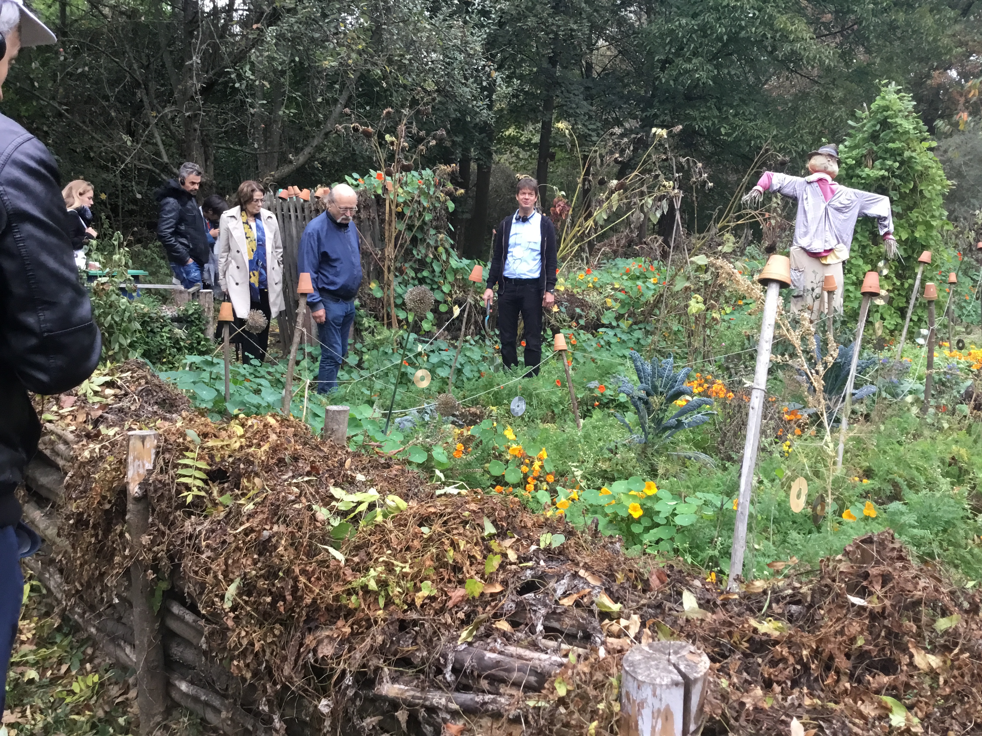 Über eine große Liegewiese geht es weiter zum Nutzgarten: „Früher gab es eine verpflichtende Ruhepause für die Schüler nach dem Mittag, dafür wurde die Wiese genutzt – das ist jetzt etwas aus der Mode gekommen“, lacht Wiese. Dann geht es in das Reich von Mohamed Maameri, der seit 1989 Gärtner und Imker der Freiluga ist. Eine Wildbienen-Nisthilfe, eine Blumenwiese, ein kleiner Apfelgarten, Möhren und Sonnenblumen stehen in und um den kleinen Mischkulturgarten. „Alle Pflanzen hier vertragen sich untereinander“, erklärt Maameri, „wir haben hier etwa 8-9 Kartoffelsorten angepflanzt.“ Das interessierte die Griechen: Ob auch alte Sorten dabei sind und woher die Samen kommen, wollten sie es genau wissen.