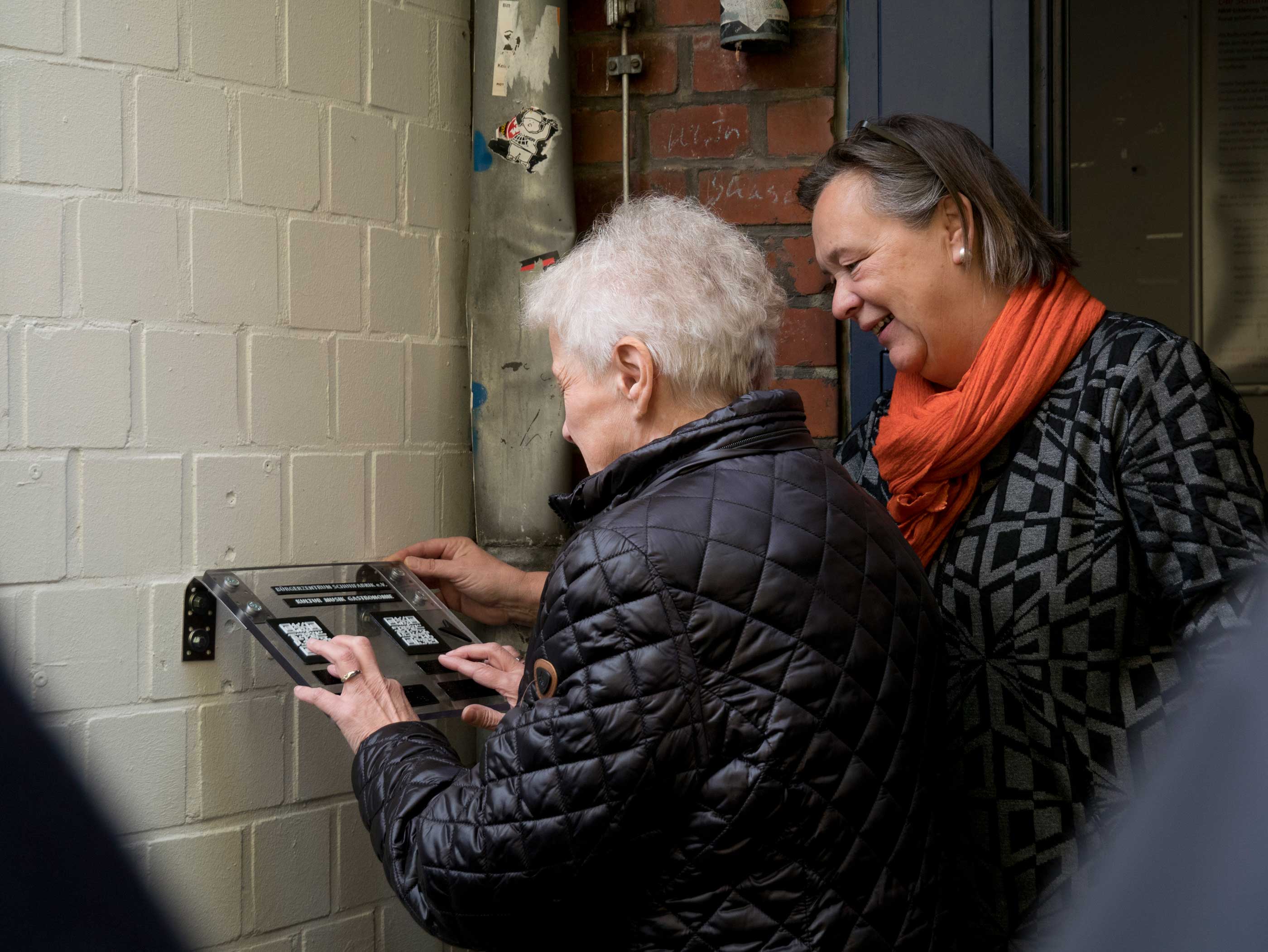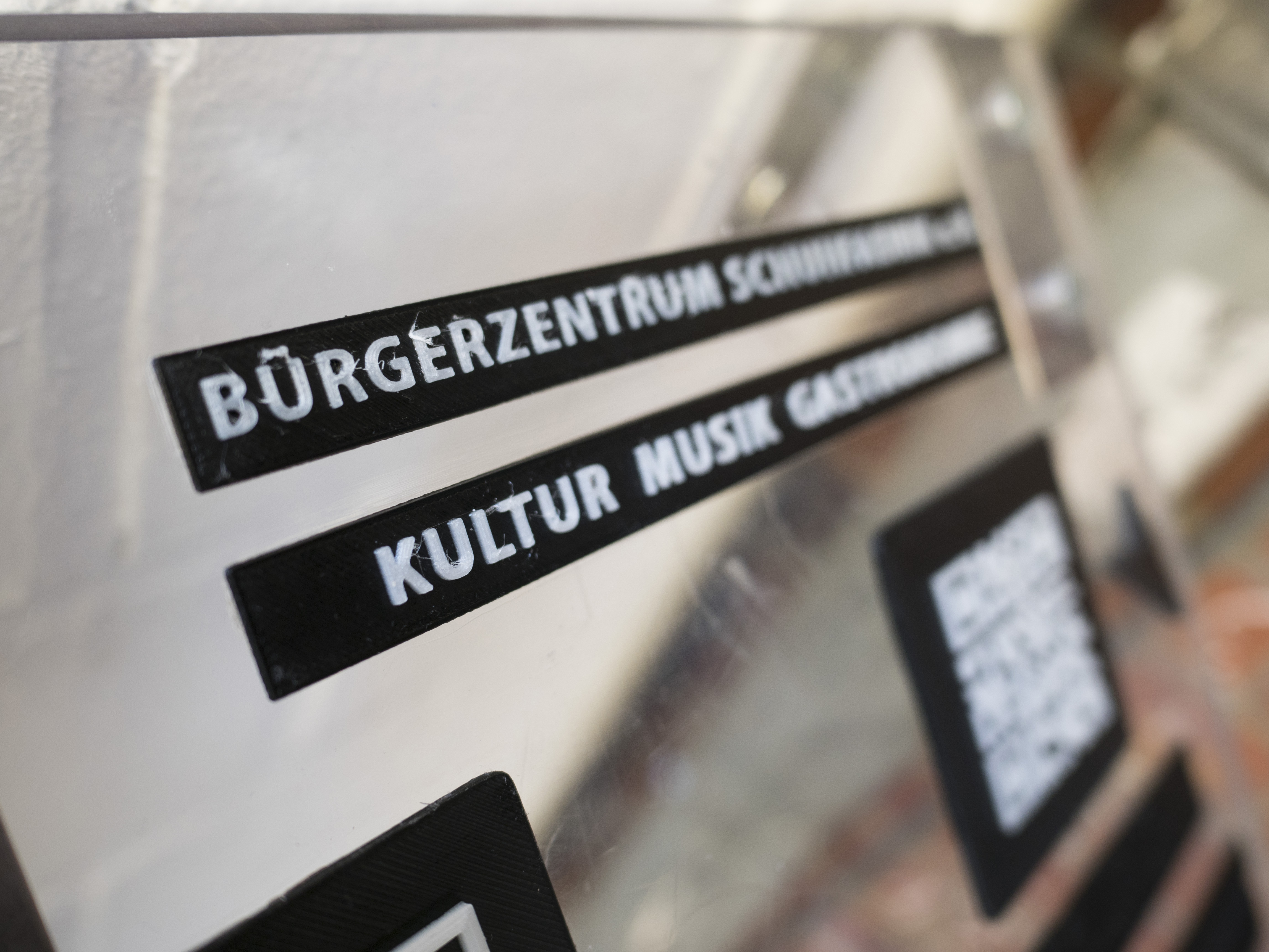 Weil die Zeit mit sechs Wochen sehr begrenzt war, haben wir uns entschieden, uns auf eine Tafel zu beschränken und eine App zu testen. Diese Tafel wurde am Eingang zum Bürgerzentrum installiert. Sie besteht aus vier verschiedenen Elementen – alle in einem 3D-Druck-Format: Also erstens der Name und Fakten zum Bürgerzentrum als relief-Format, dann der Name und Basisinformationen in der Blindenschrift Braille auf Deutsch sowie zwei QR-Codes, die mit dem Handy gescannt werden können. Das funktioniert so: Der erste vermittelt Hinweise zu den Einrichtungen im Bürgerzentrum und der zweite erklärt die Geschichte des Gebäudes. Zuletzt gibt die Tafel auch Hinweise zur Orientierung, indem sie Norden kennzeichnen. Weil die meisten öffentlichen Gebäude in Deutschland älter sind, dachten wir, dass es gut ist, eine Idee von der Geschichte entstehen zu lassen.
