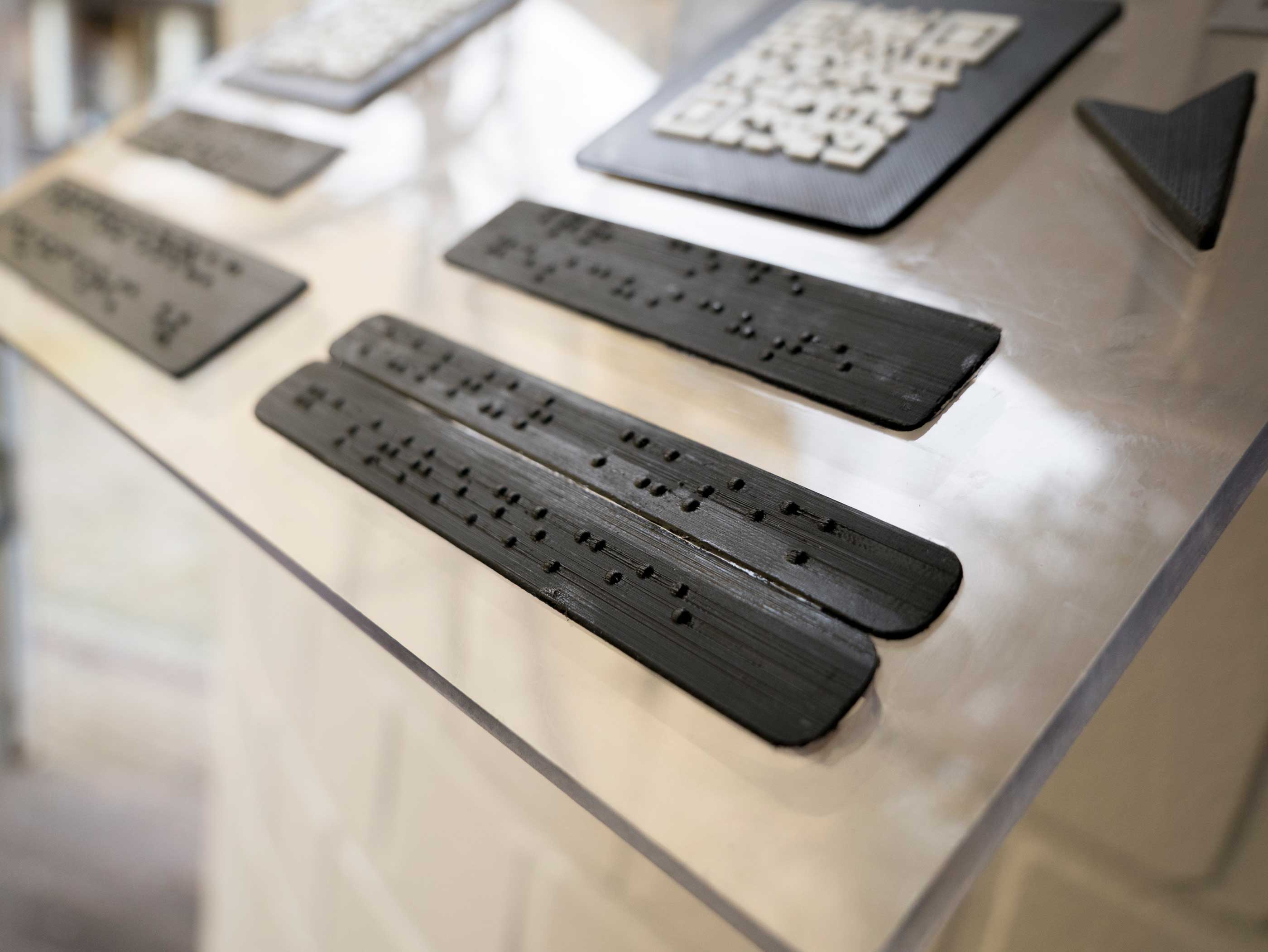Die Form der Information hat mehrere Zwecke: Der 3D-Druck ist eine neue Technologie, die sich bislang als sehr flexibel bewiesen hat, weil sie mehrere Tests bestanden hat als langlebiges und zu recyclendes Material. Die Sprachnachricht, die per QR-Code aktiviert wird, kann sehr leicht angewählt und per Kopfhörer abgehört werden. Für mich war es das zweite Mal, das ich mit dem 3D-Druck gearbeitet habe. In beiden Fällen war ich die Person, die die Vorarbeit für die Inhalte und Ideen für das Format entwickelt hat. Das Design kam immer von Experten. In der Schuhfabrik hat Jens Höckelmann die Drucke entwickelt und Änderungen vorgenommen. Es hat ein paar Tests gebraucht, bis wir die richtige Größe und Dicke der Drucke, die Dichte der Braille-Schrift und die Art des Druckens raus hatten.