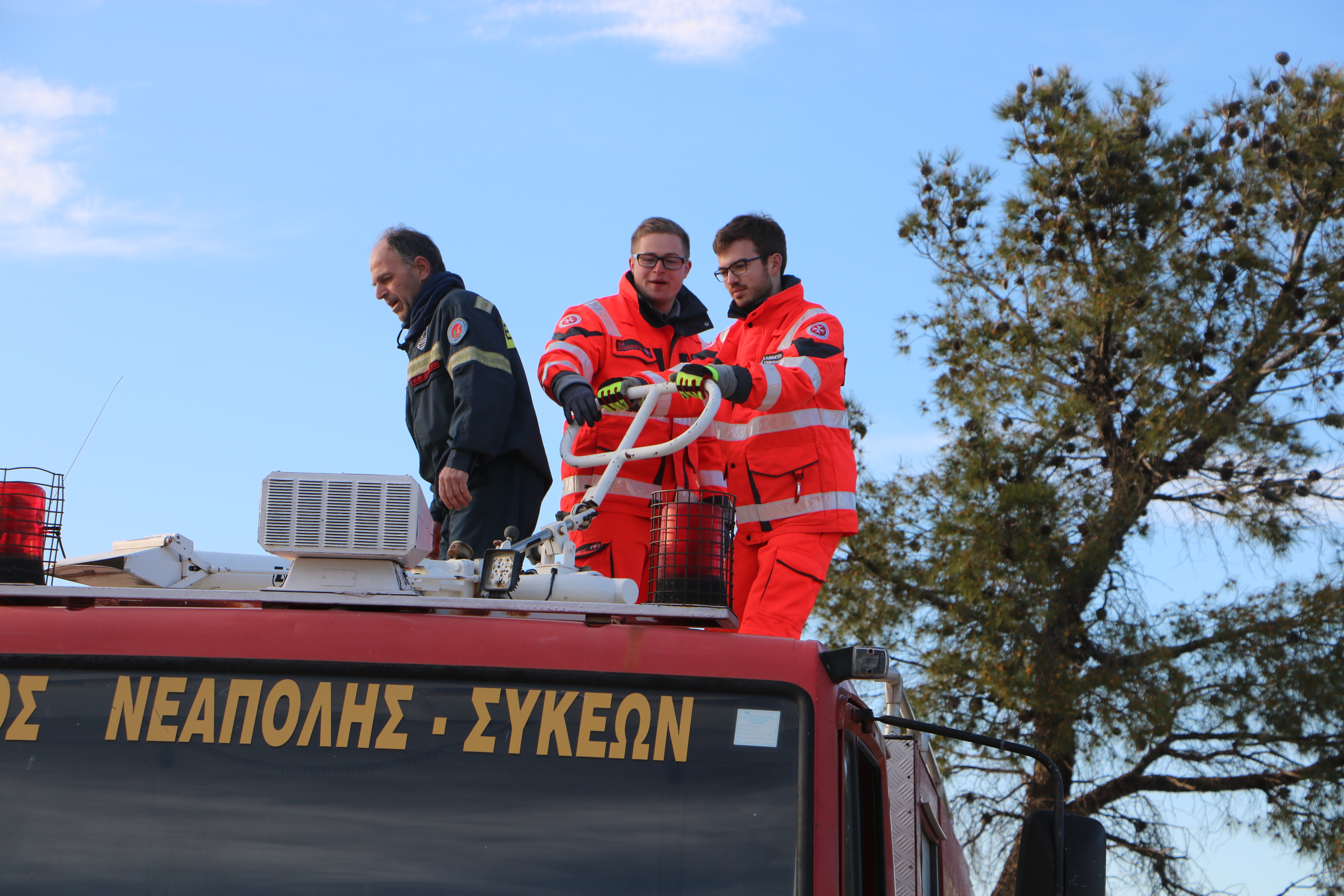 Λαζαρίδης: Ακριβώς, η βασική ομάδα παρέμεινε, αλλά υπήρχαν και νέα άτομα, γιατί φυσικά δεν είχαν όλοι χρόνο και για τις δύο επισκέψεις. Στη Γερμανία, μια τέτοια ανταλλαγή στην πολιτική προστασία αναγνωρίζεται ως εκπαιδευτική άδεια, αλλά δυστυχώς αυτό δεν ισχύει στην Ελλάδα: υπάρχει ένας αριθμός μέγιστων ημερών απουσίας στο ελληνικό εκπαιδευτικό σύστημα – αυτό ισχύει ανεξάρτητα από το αν είσαι άρρωστος, αν συμμετέχεις σε άσκηση πολιτικής προστασίας ή αν σβήνεις πυρκαγιά.
