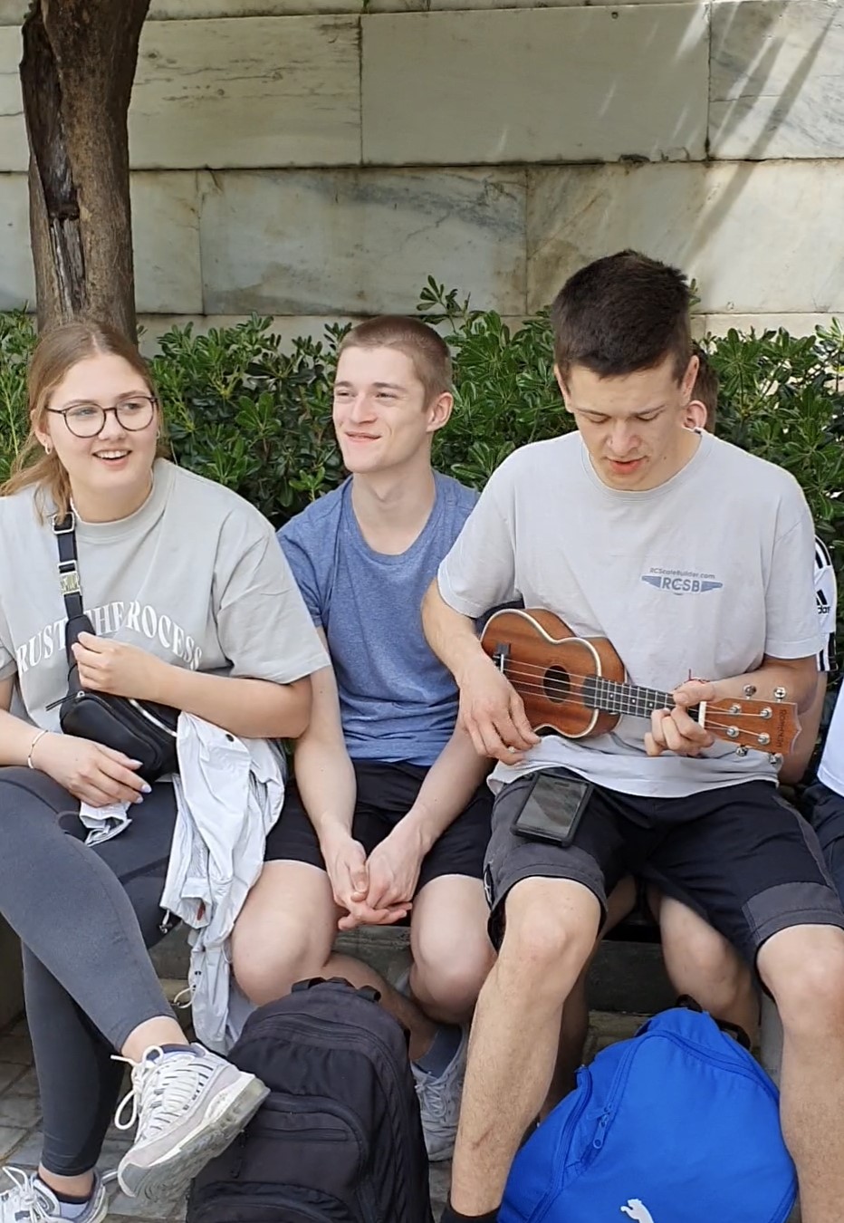 Uns fiel immer wieder auf, dass in Griechenland Musik eine große Rolle spielt. Moritz kaufte sich am ersten Tag eine Ukulele, die er, wie Mario, ein griechischer Austauschschüler, im September bei uns auch, immer dabei hatte. Sehr zur Freude der Gruppe, aber auch anderer Mithörer*innen.