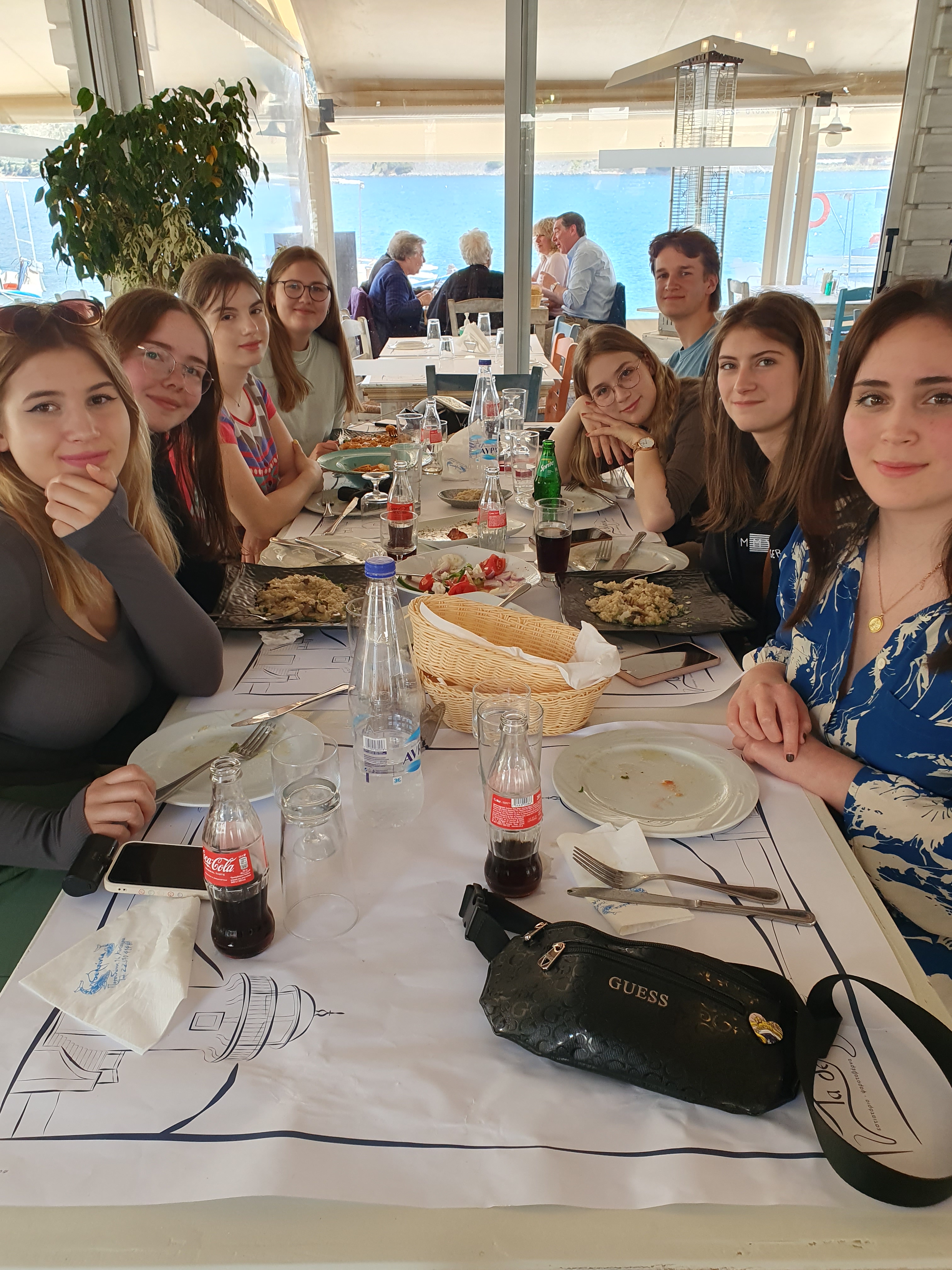 Als sie uns dann noch ihren Nachtisch schenkten, redeten wir weiter mit ihnen. Sie interessierten sich sehr für unsere Athen-Reise und wir waren interessiert an ihren Ansichten über Griechenland und Deutschland. Wir sprachen über Schule, Kultur, Sprachen und auch über Distomo und die Nazi-Besatzung. Sie haben uns gefragt, wie intensiv das Thema in deutschen Schulen gelehrt wird. Wir antworteten, dass man zwar sehr viel über den Nationalsozialismus lernt, aber das Thema Griechenland dabei etwas untergeht. Sie waren sehr erfreut darüber, dass wir daran arbeiten, den Menschen in Deutschland die Geschichte von Griechenland und Distomo etwas näher zu bringen. Im griechischen Schulsystem wird laut den Männern viel über Distomo gesprochen.