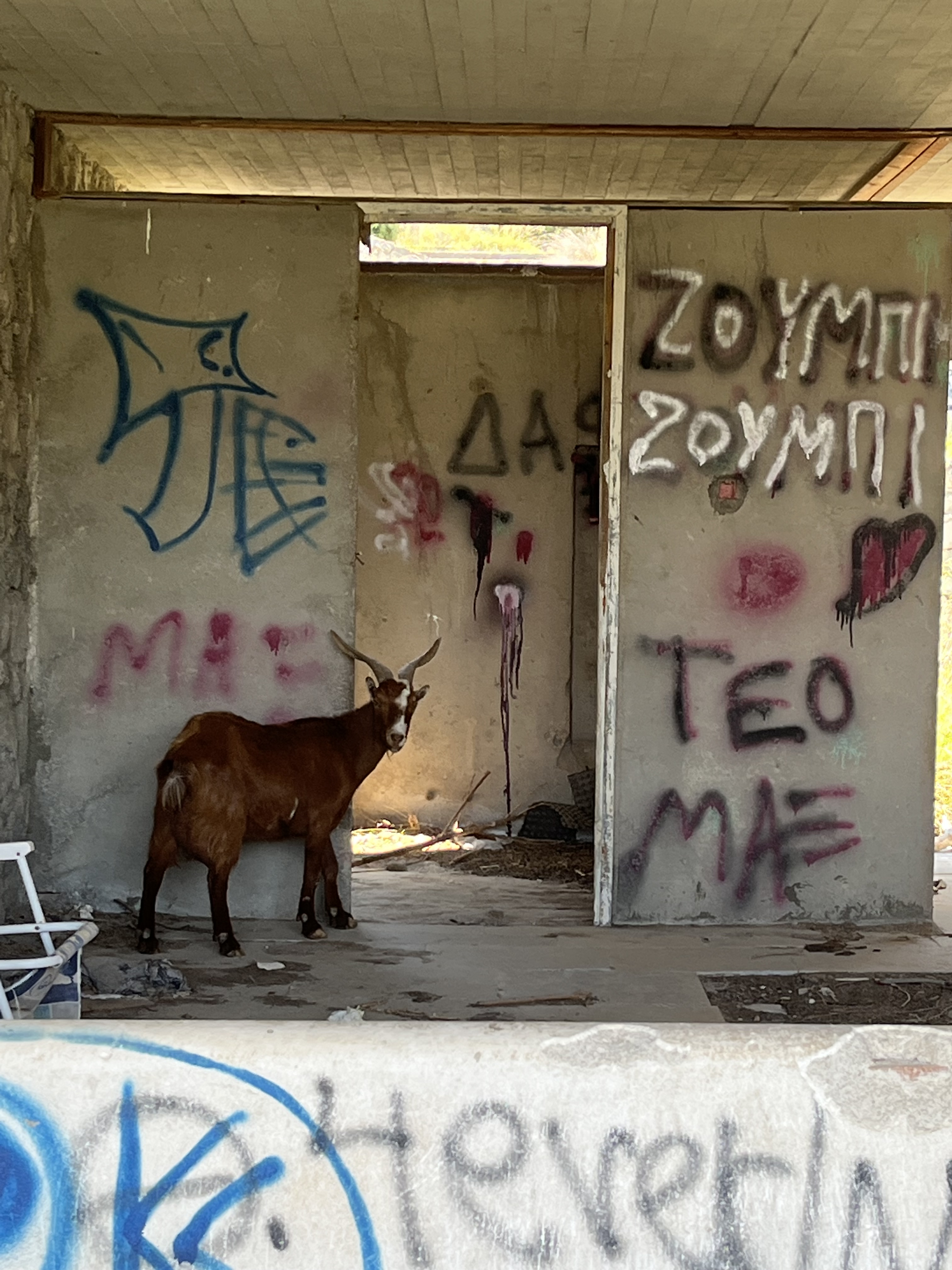 In der Nähe des Strandes haben wir in verlassenen Gebäuden eine Ziege entdeckt, was zum Namen der Insel passt: Ägina, die Ziegeninsel. Abends trafen sich alle zu einem letzten Essen und verabschiedeten sich voneinander.