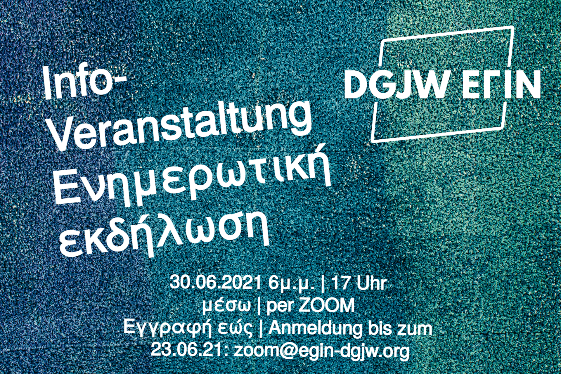 🇩🇪 Das Deutsch-Griechische Jugendwerk (DGJW) lädt zu einer zweiten digitalen Info-Veranstaltung über die Förderrichtlinien, das Antragsverfahren, die Fristen, Angebote und Kontakte zum DGJW ein. Die Veranstaltung findet am Mittwoch, 30. Juni 2021 um 17:00 Uhr (MESZ) digital über die Plattform Zoom statt und wird gedolmetscht.